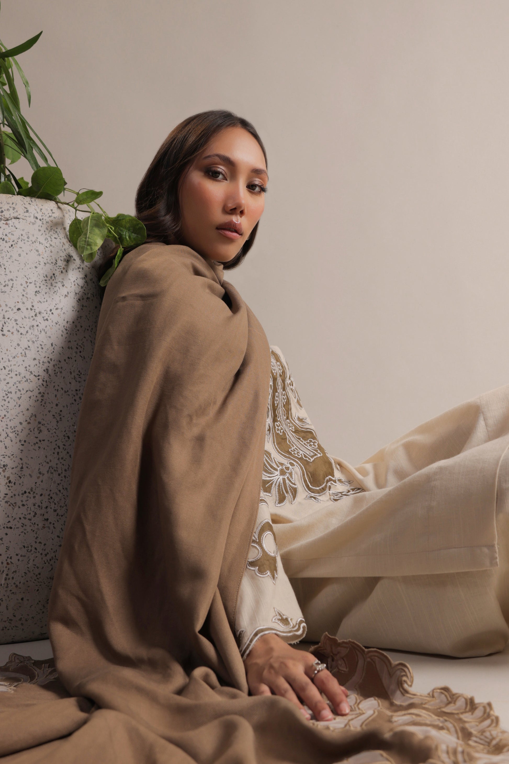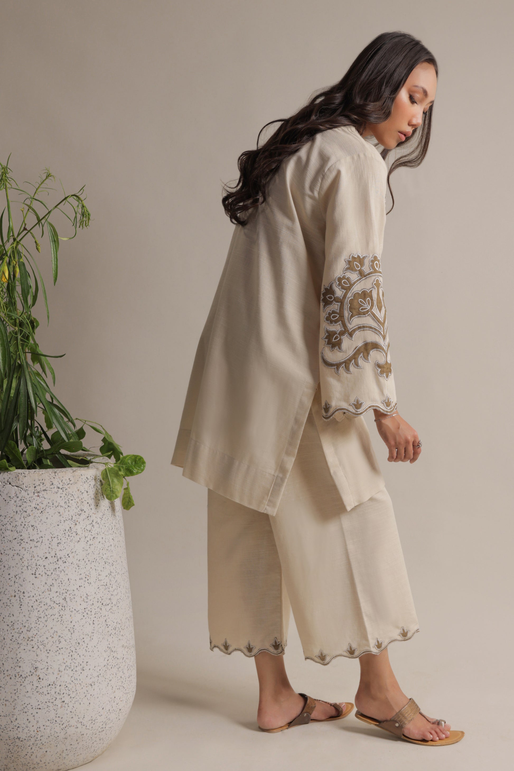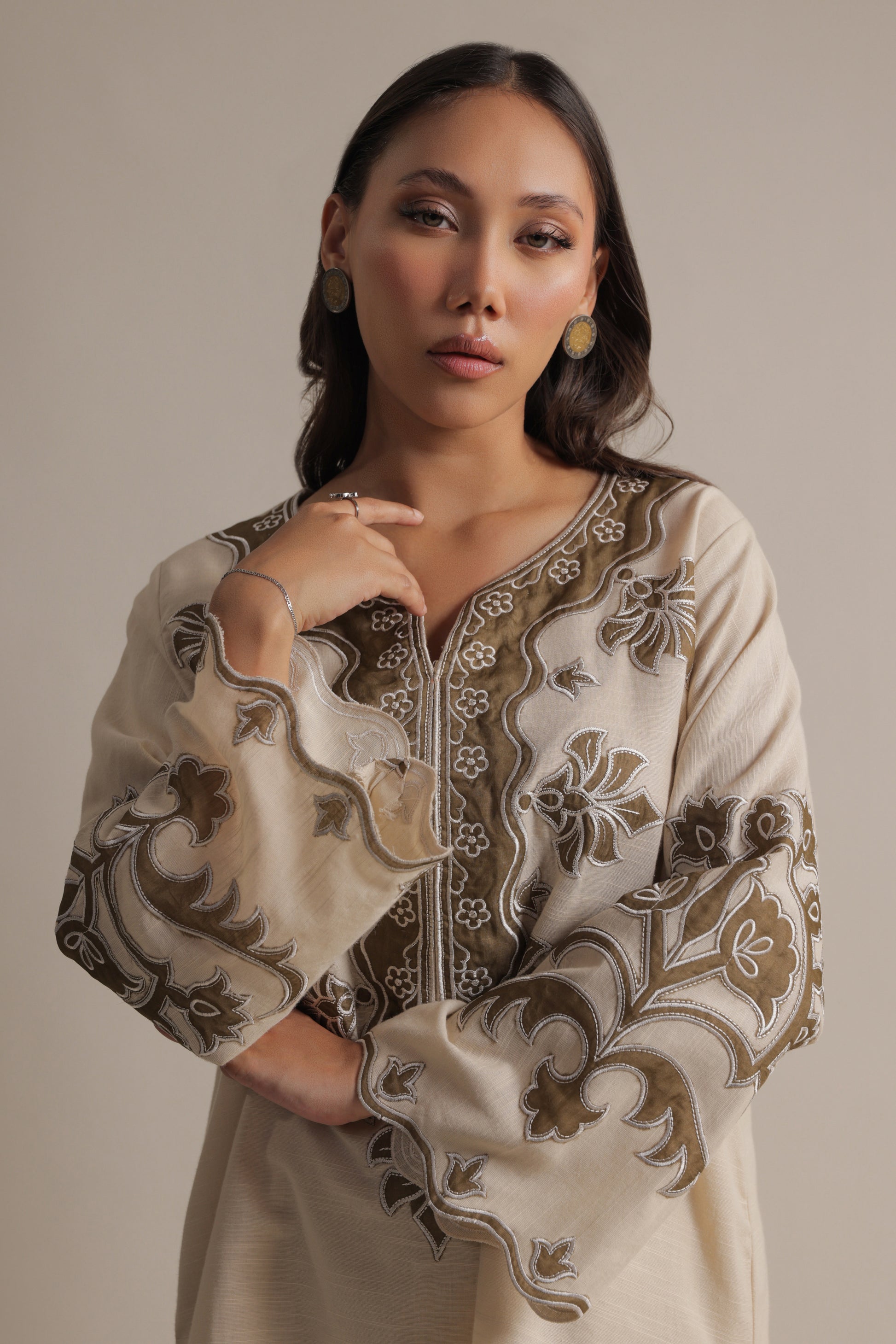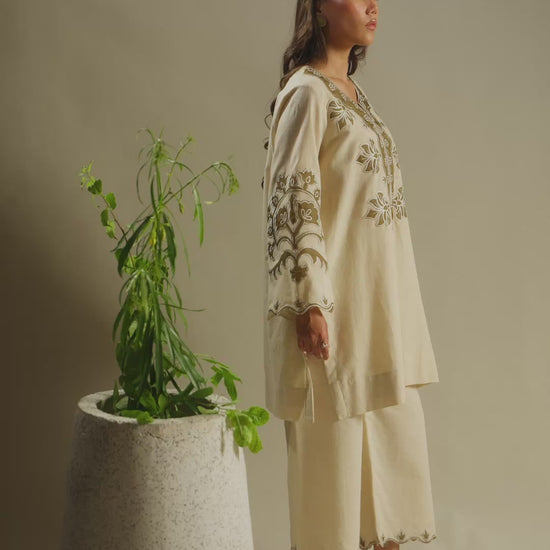 An outfit that is designed to be worn through-out the season and beyond. This head-turning style is accented with appliqué work on the neckline and sleeves and comes with a matching complimentary izaar for an effortless look that radiates warmth and ease.