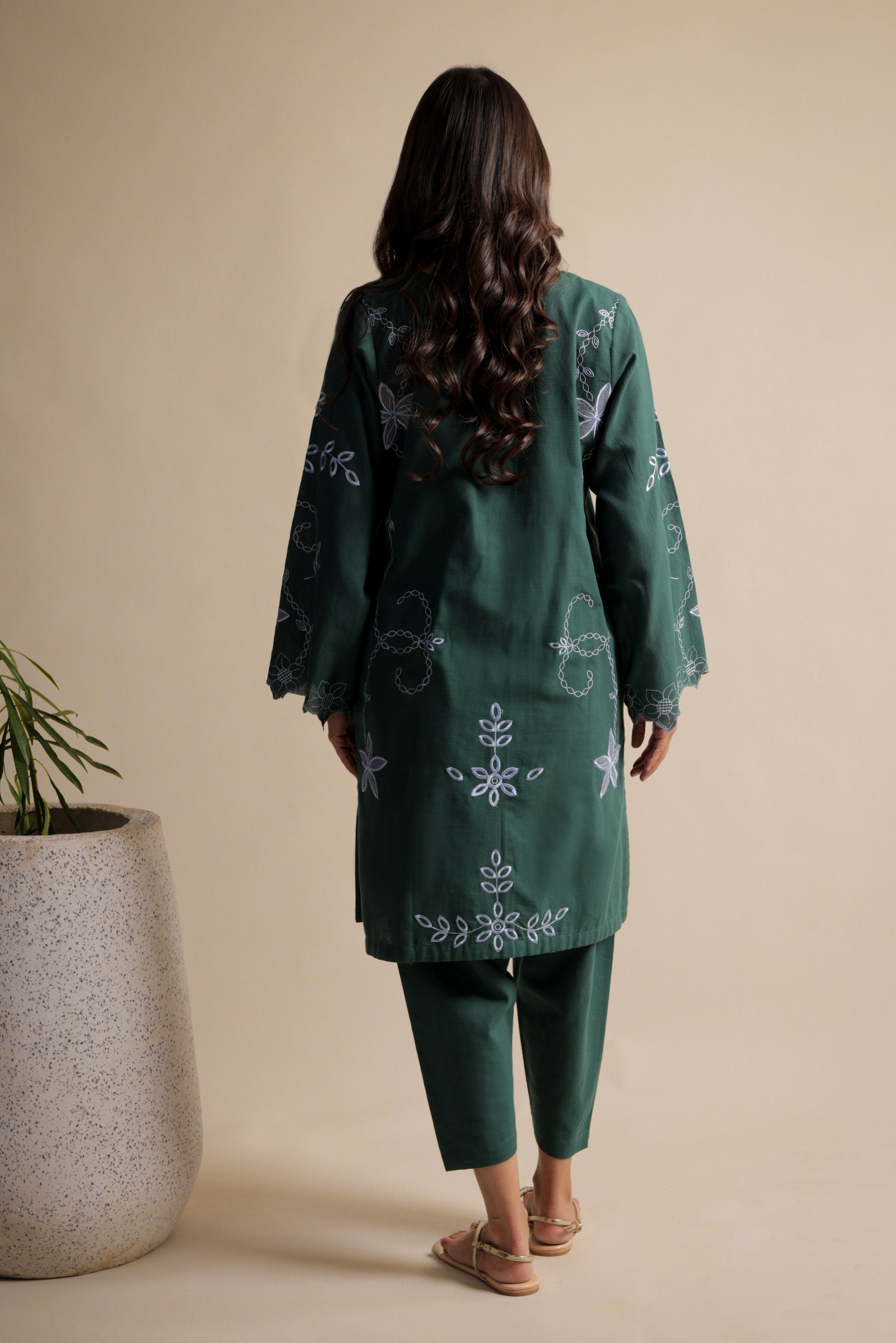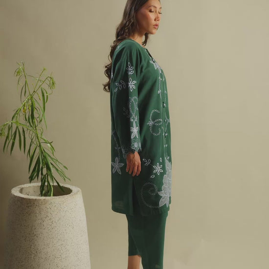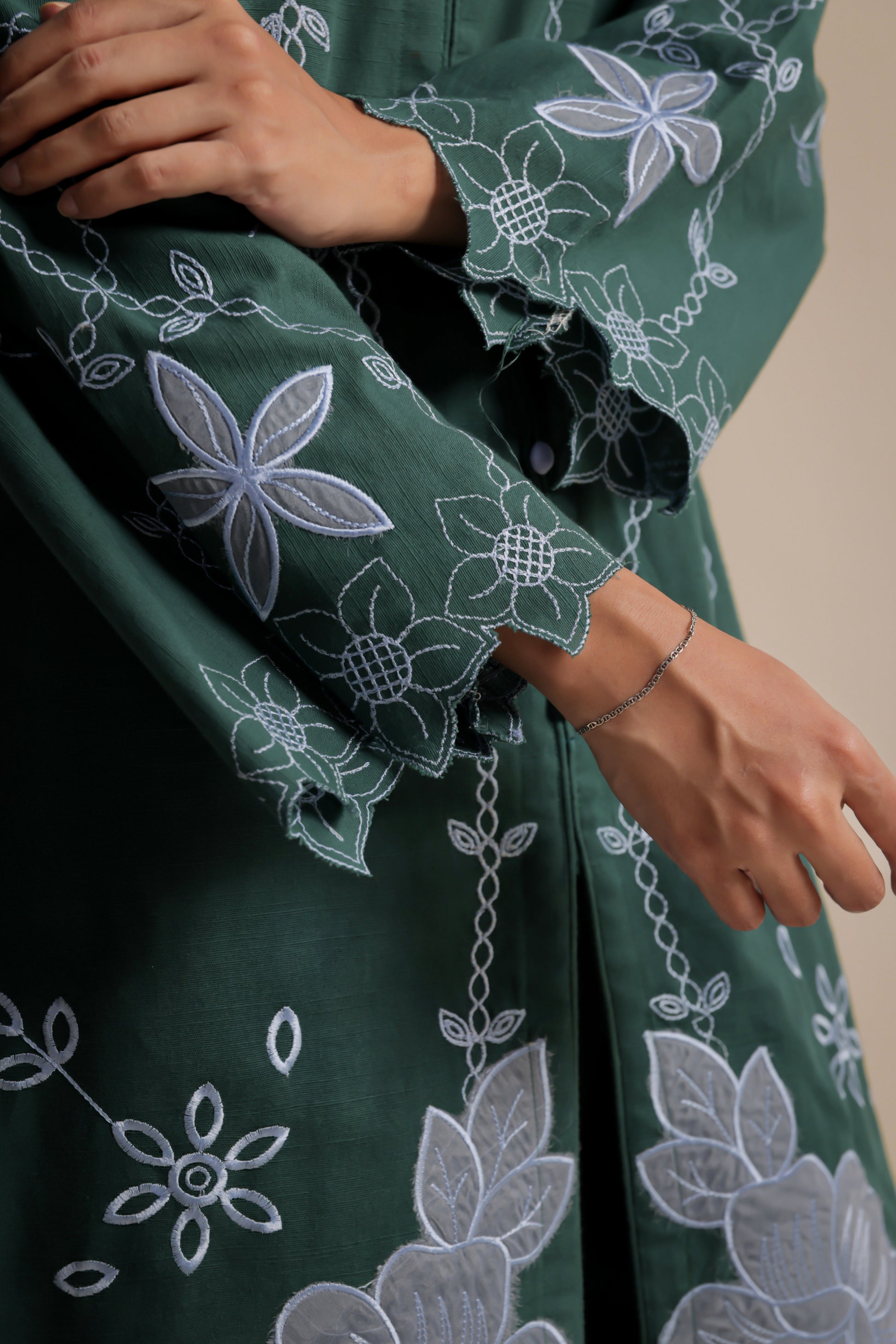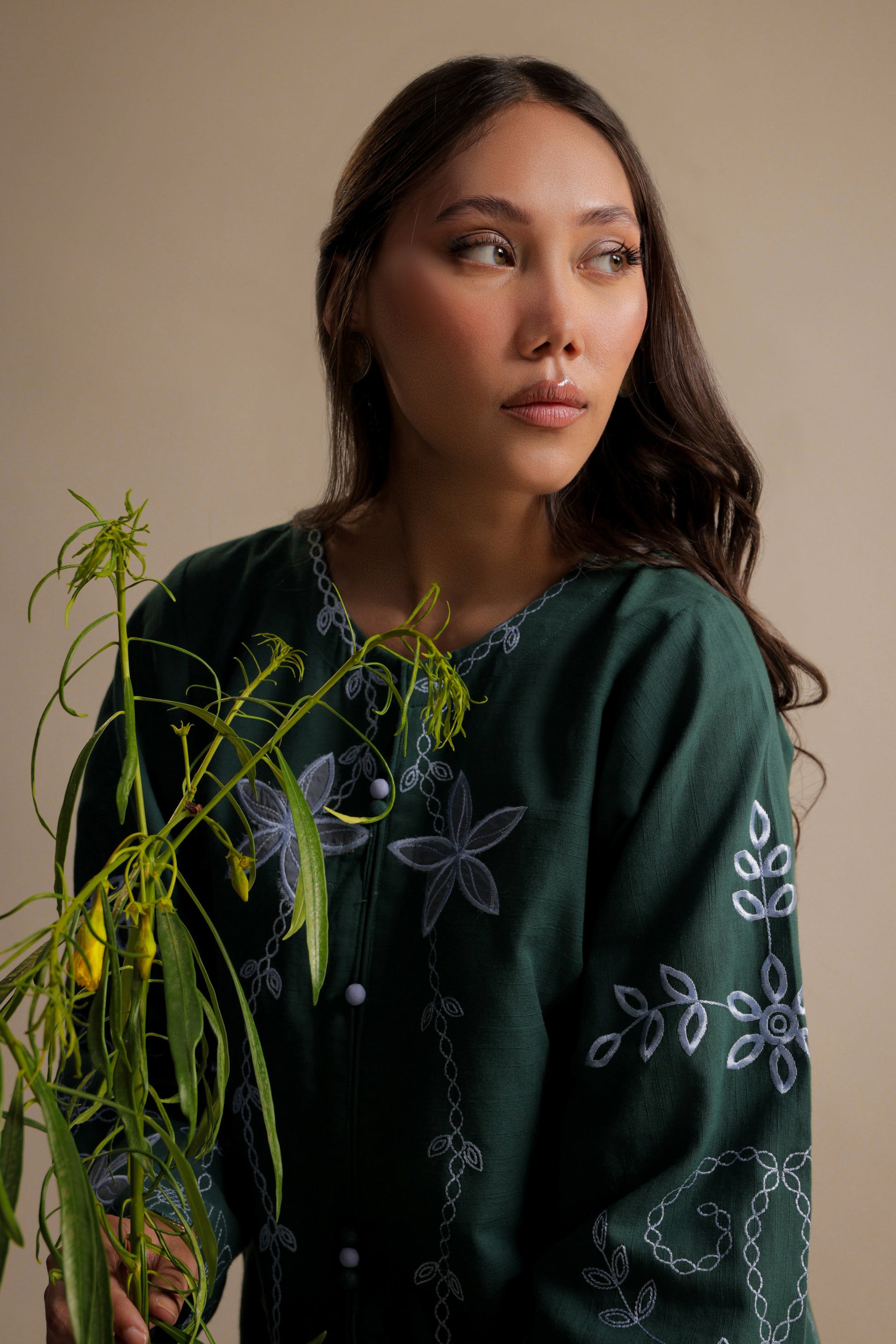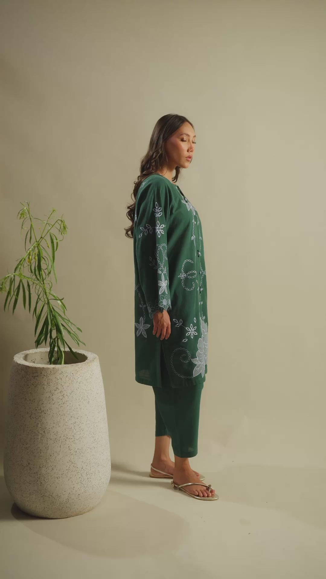 A playful take on fall dressing, this kurta-shalwar set features playful embroidery with appliqué details in a quirky, vibrant contrast and is designed for those who love adding a touch of fun to their wardrobe. It is the perfect blend of breezy style and free-spirited energy.