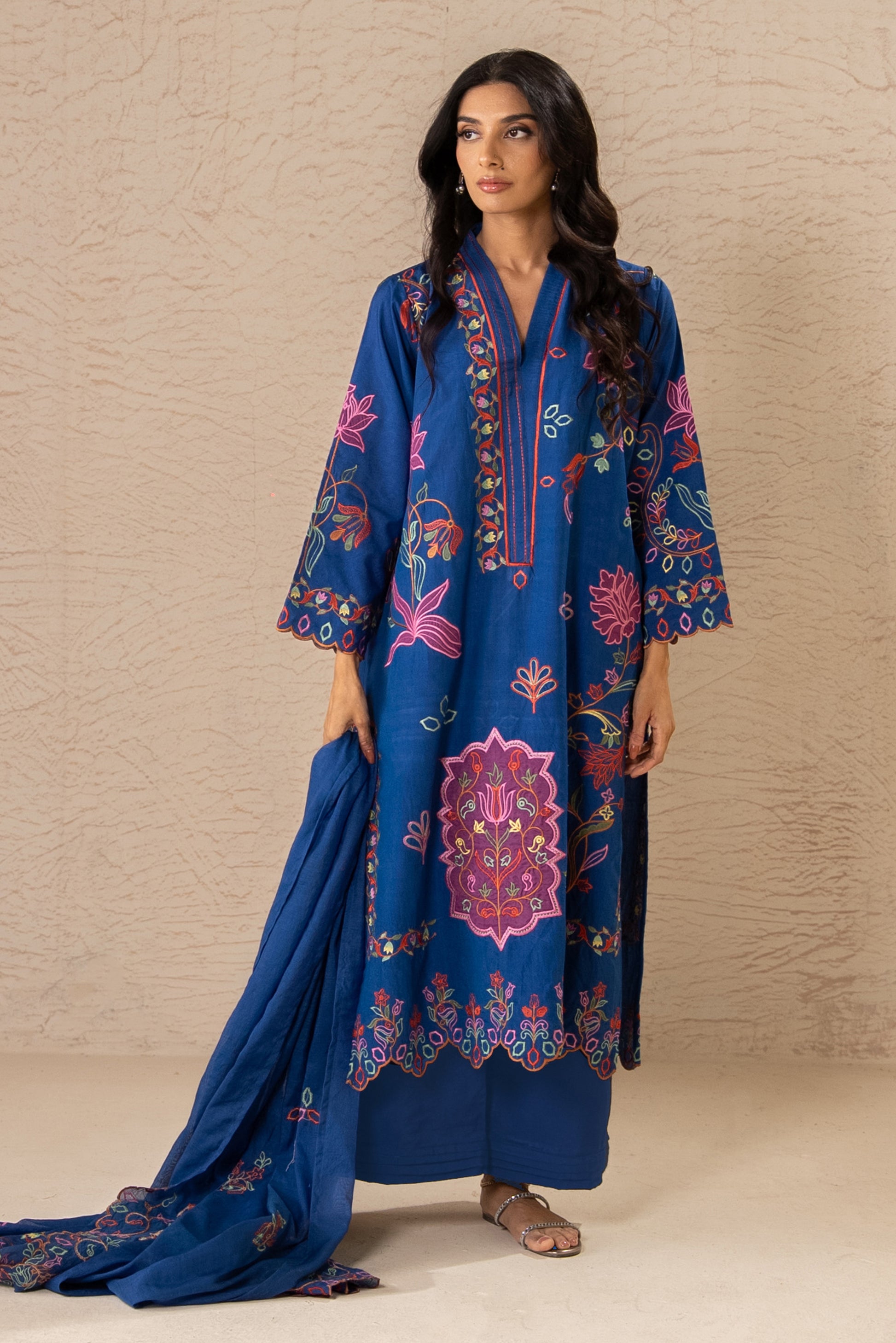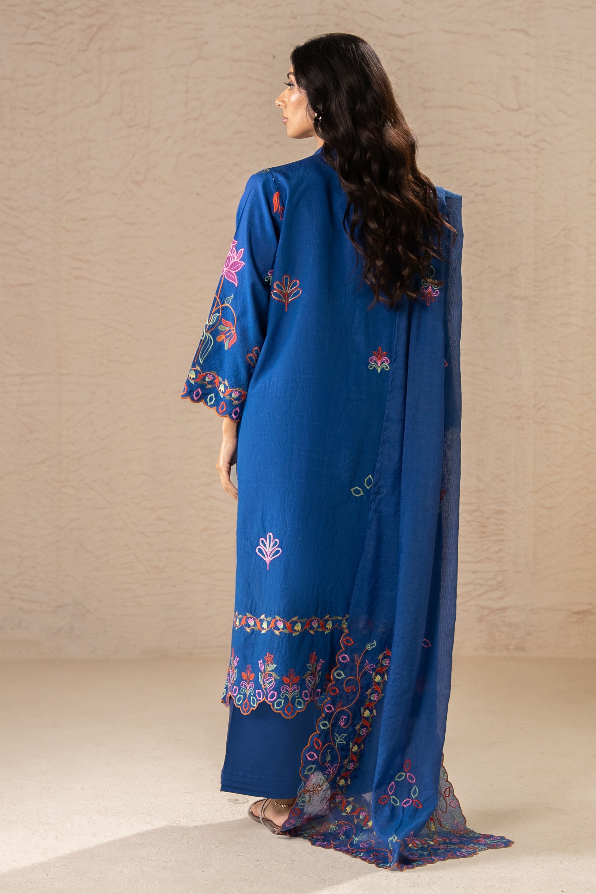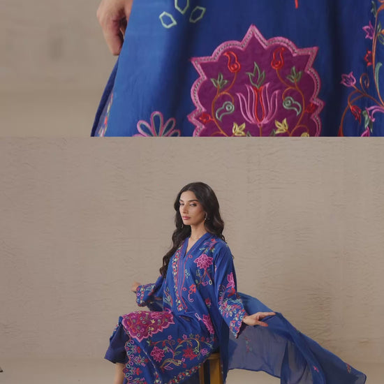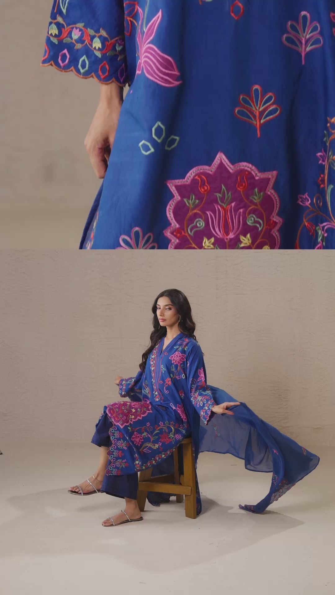 Midnight Bloom is set on a rich indigo canvas and is adorned with eclectic floral embroidery and appliqué motifs layered in vibrant hues. It comes with a matching embroidered dupatta and izaar, celebrating colourful artistry and refined detail for evening festivities under the stars.