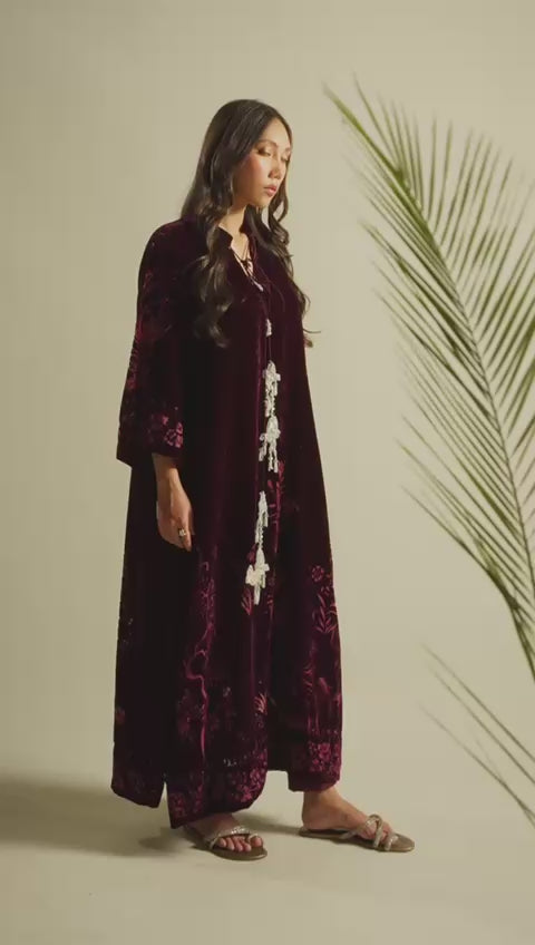 Our velvet kaftan in a dreamy plum shade features a burnout devoré pattern with beautiful chinoiserie motifs. Effortless yet statement-making, it is the perfect piece to carry you through festive gatherings, a casually elegant wedding feast, or an intimate dinner.