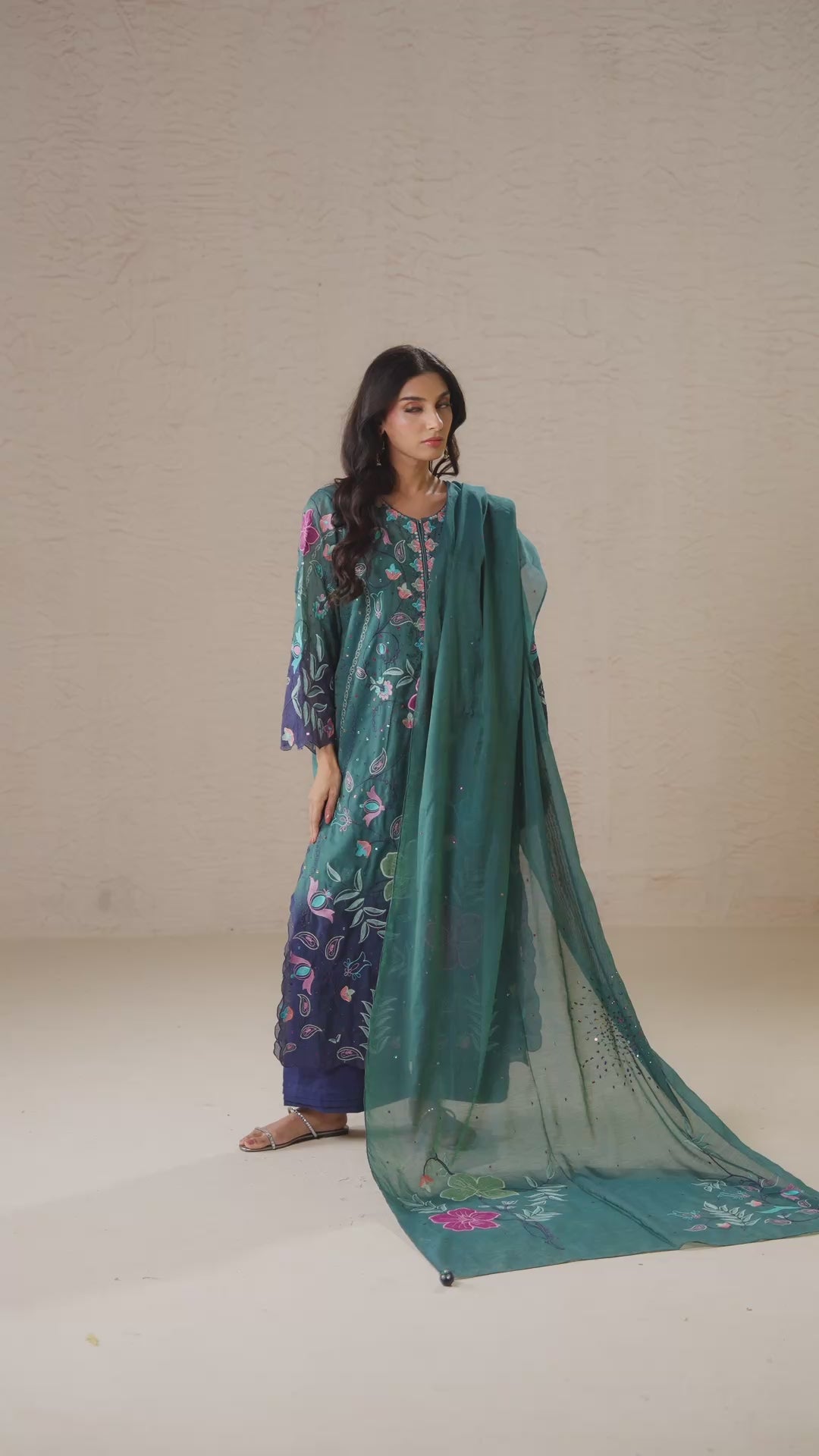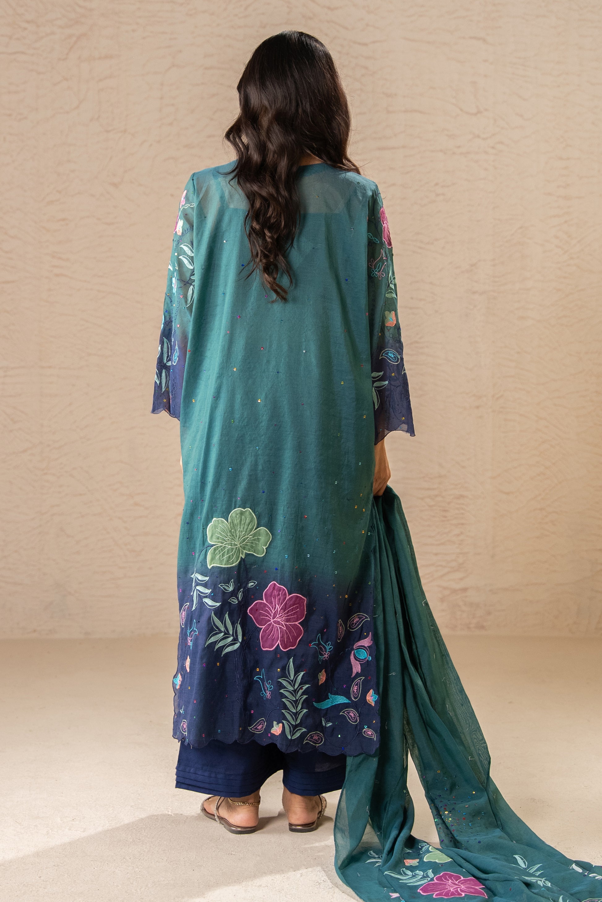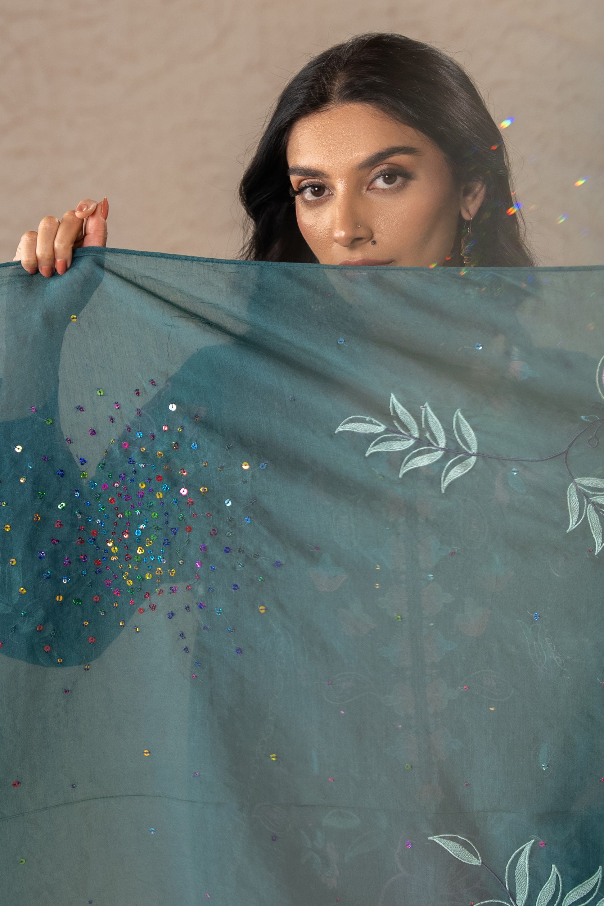 Starry Night is an ombre dream in vibrant peacock shades. It is adorned with floral appliqué motifs and layered with a cascade of colorful sequins. This ensemble celebrates craftsmanship and festive whimsy, perfect for moonlit soirées and twilight celebrations.