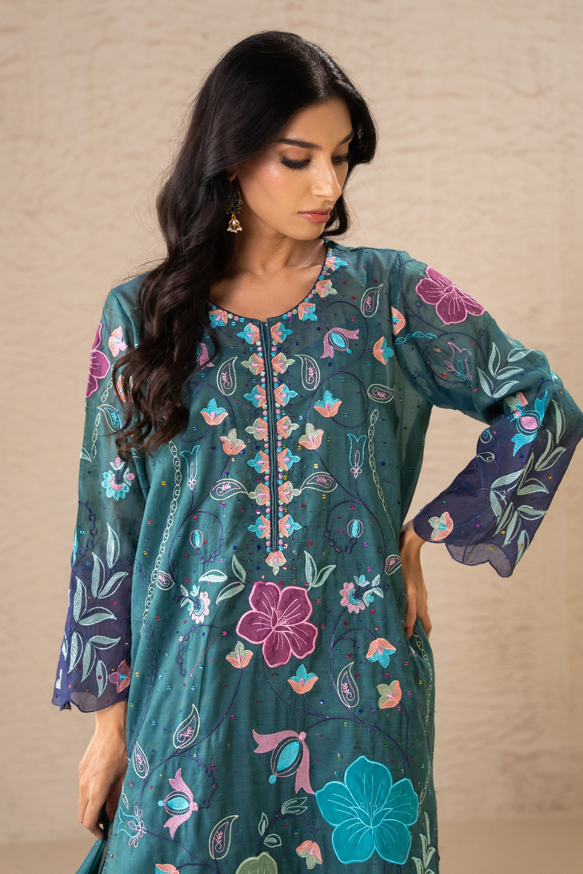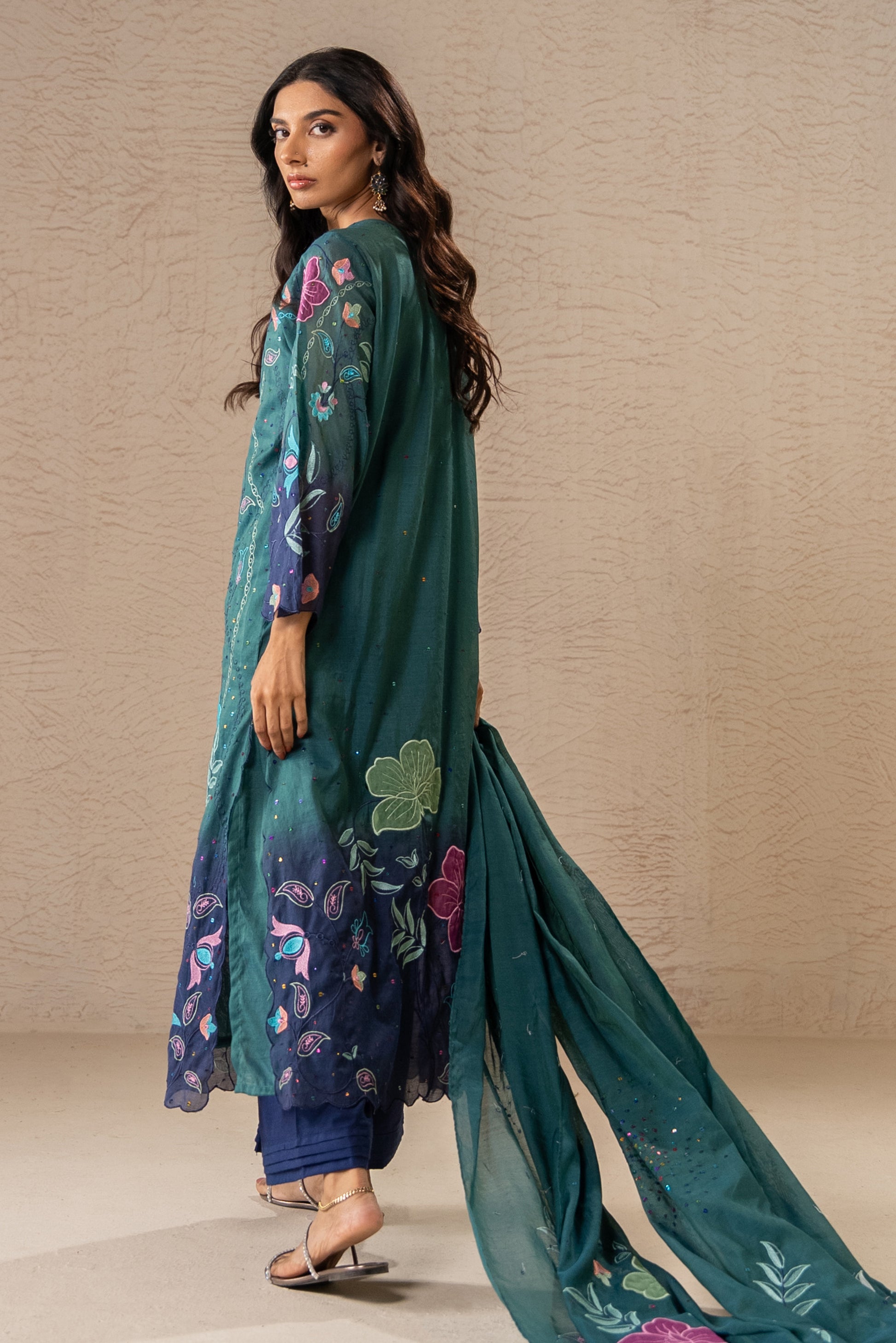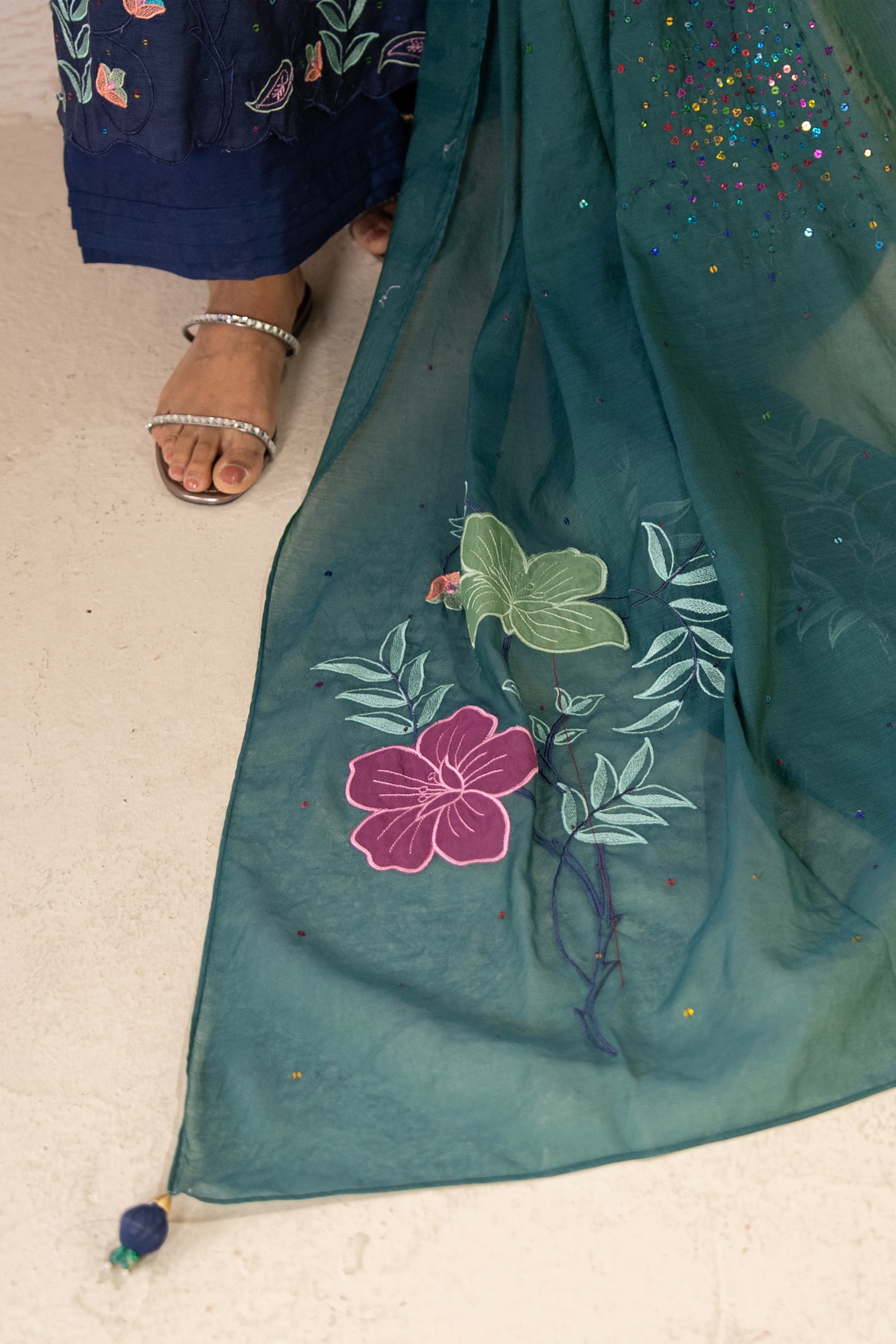 Starry Night is an ombre dream in vibrant peacock shades. It is adorned with floral appliqué motifs and layered with a cascade of colorful sequins. This ensemble celebrates craftsmanship and festive whimsy, perfect for moonlit soirées and twilight celebrations.